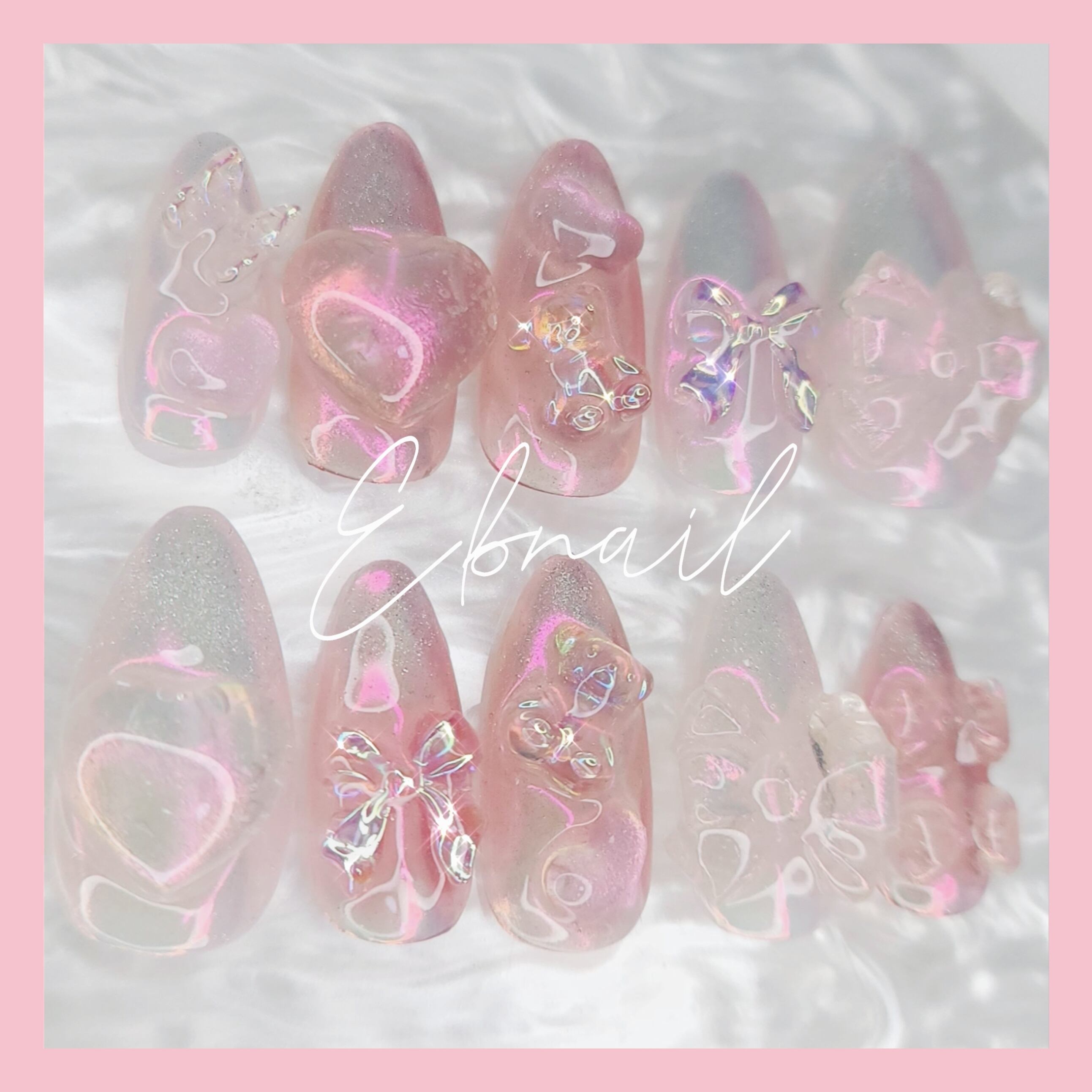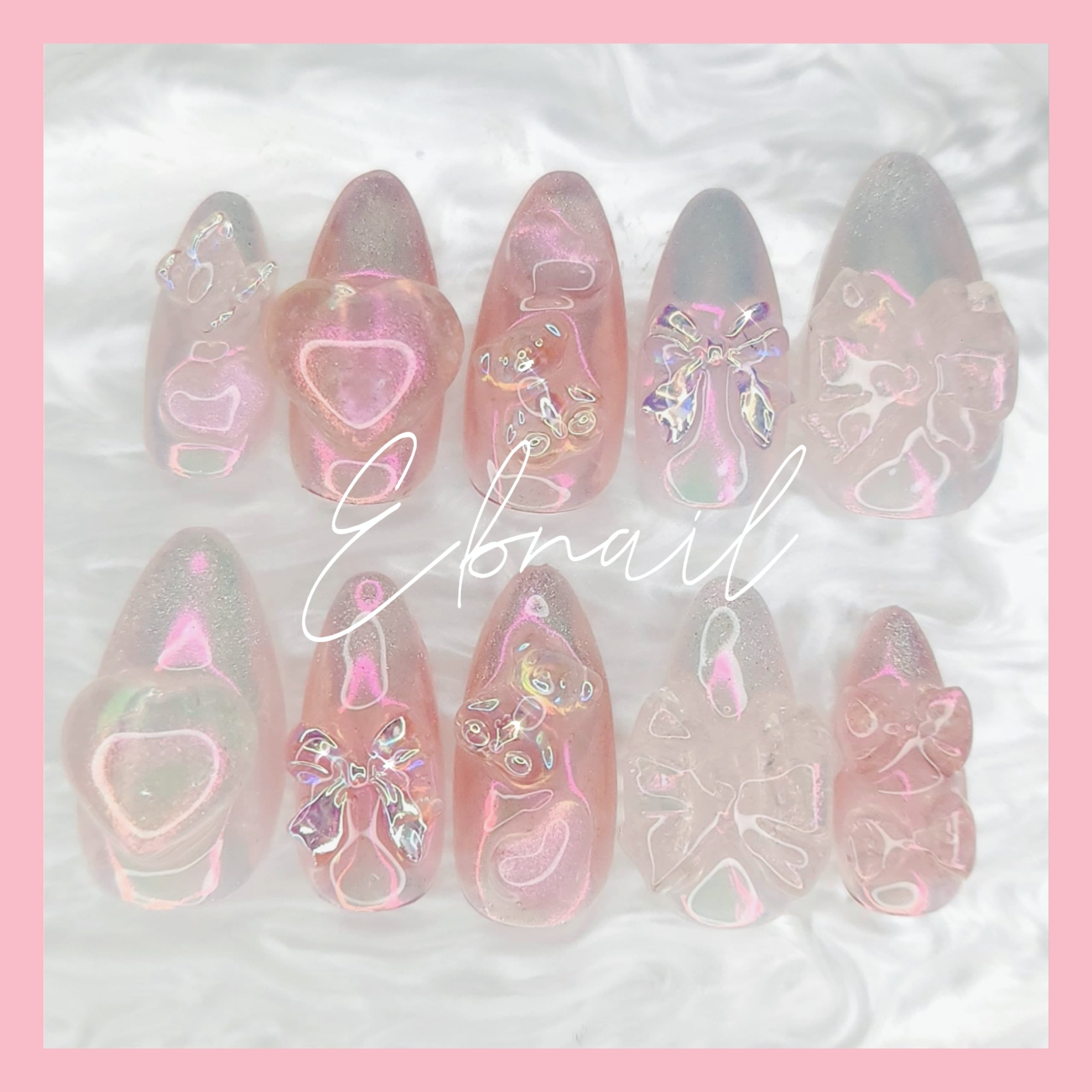 #13 ネイルチップ オーロラ ピンク うるうるネイル 韓国 ハート リボン くま